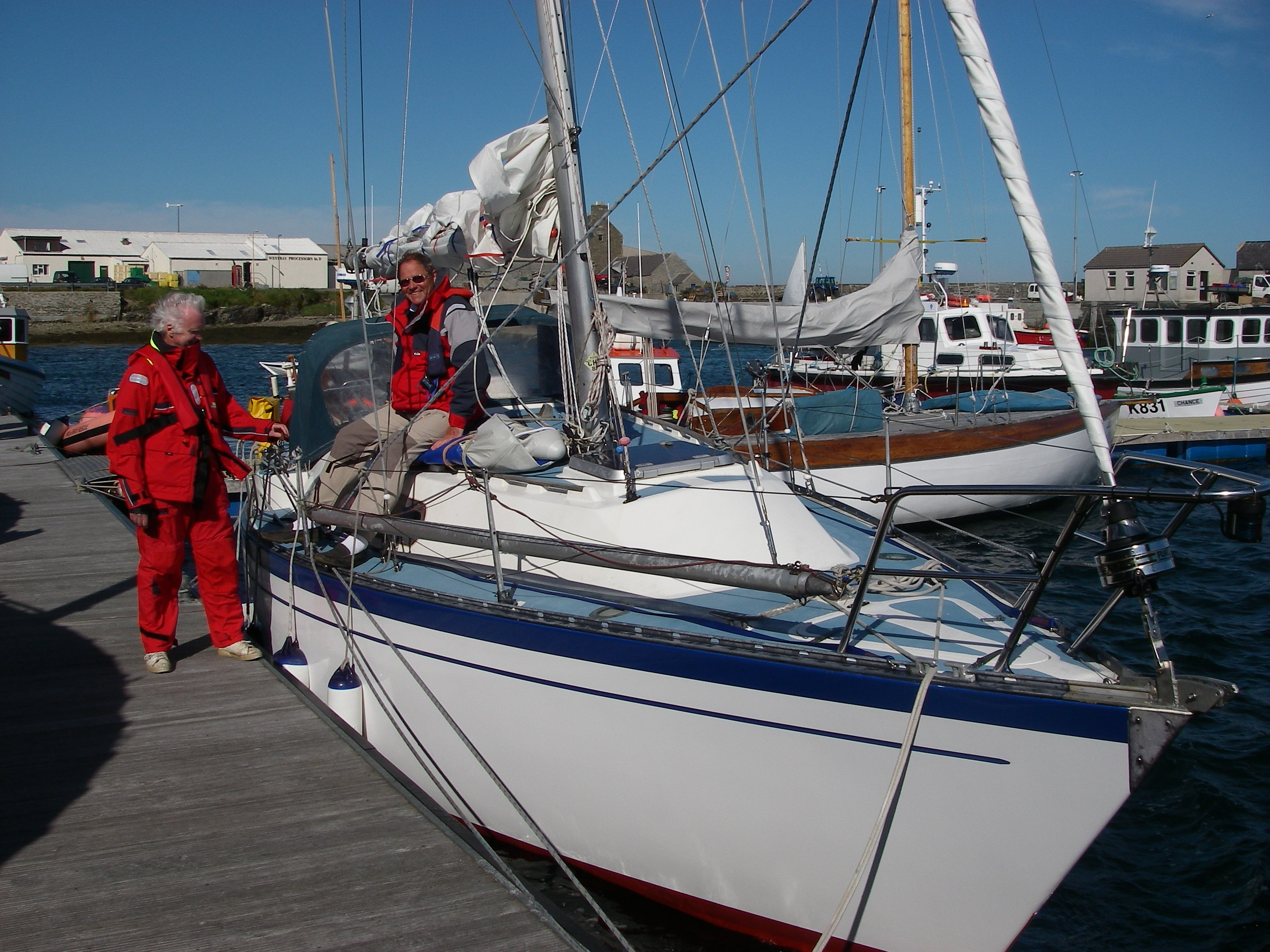 By the time we got to the harbour at Pierowall, the wind was gusting seven, and as we entered the little harbour I saw with some alarm that the only free berth was at the end, broadside on to the wind, requiring a sharp turn at the last minute. With the sails put away the wind was still trying to accelerate the boat, and we saw with relief the harbourmaster appear with an enormous fender, much bigger than ours. As we turned at right angles to come alongside he thrust the fender down just in time for the impact as the wind drove us sideways on with quite a force. We were very grateful to him as the boat ground to a halt.