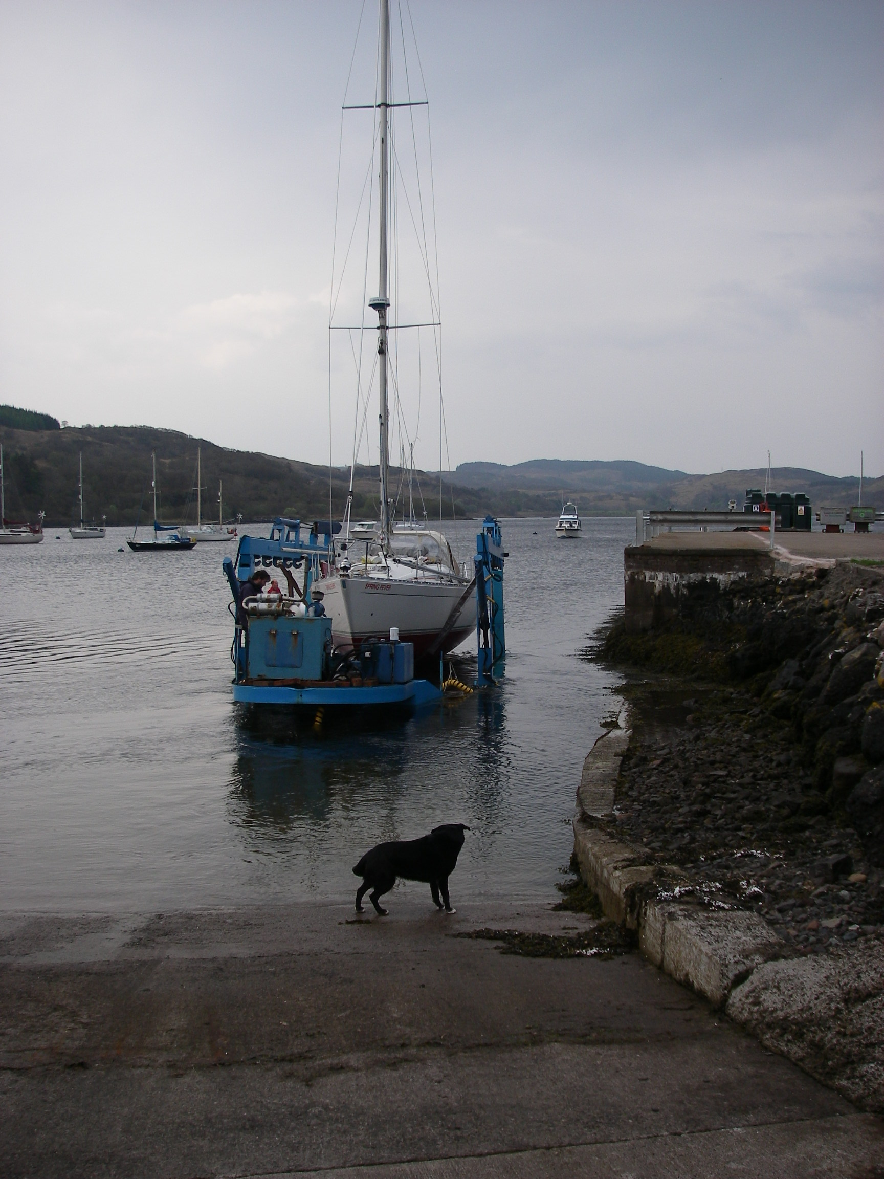 We arrived at Ardoran Marine on 4 May to stay at one of the three chalets the boatyard owns, with a few days fitting out planned. (Peter, Christine, Tony, Elaine and Nigel). Ardoran stores boats in an old quarry behind the main workshop, and we found Spring Fever in excellent condition, dry inside and well cared for, with the anti-fouling done ( a present to ourselves because of the 500 mile drive to reach her.) All the work we commissioned had been done well, and problems we had during commissioning were sorted out immediately at fair prices, so we certainly recommend the yard. It was also very friendly, and in a beautiful position on Loch Feochan. The chalets would be good for a holiday even without a boat. The owners run the boatyard alongside their farm, which includes a herd of highland cattle,