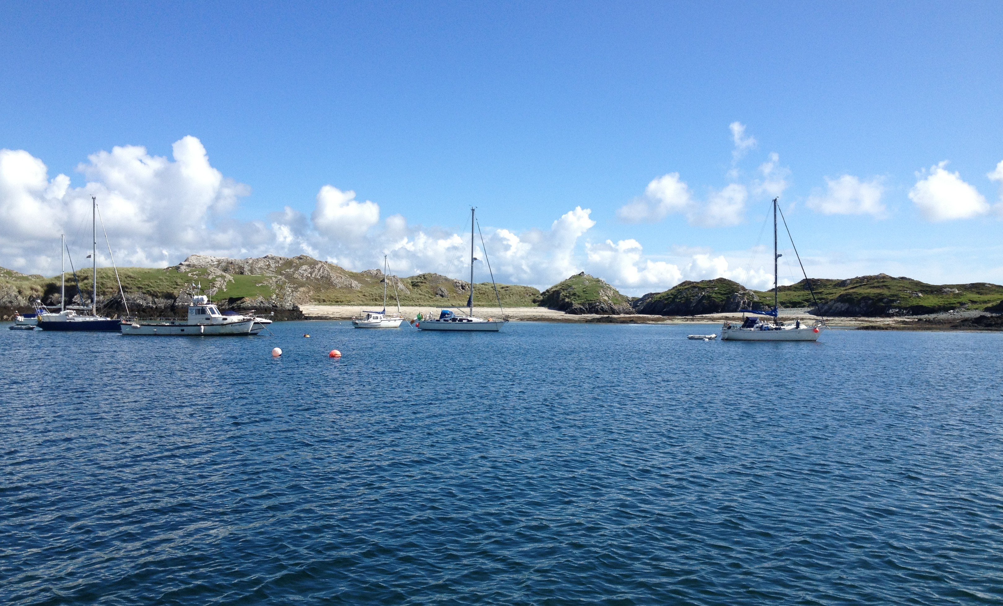 A lovely sunny day, though you wouldn’t know it from the forecast. The bad weather seemed to hang over the Mayo and Connemara mainland, where there were great storm clouds. Motorsailed in light winds past the 2000 foot cliffs of Achill Island, with Clare Island in the distance, to Inishboffin.