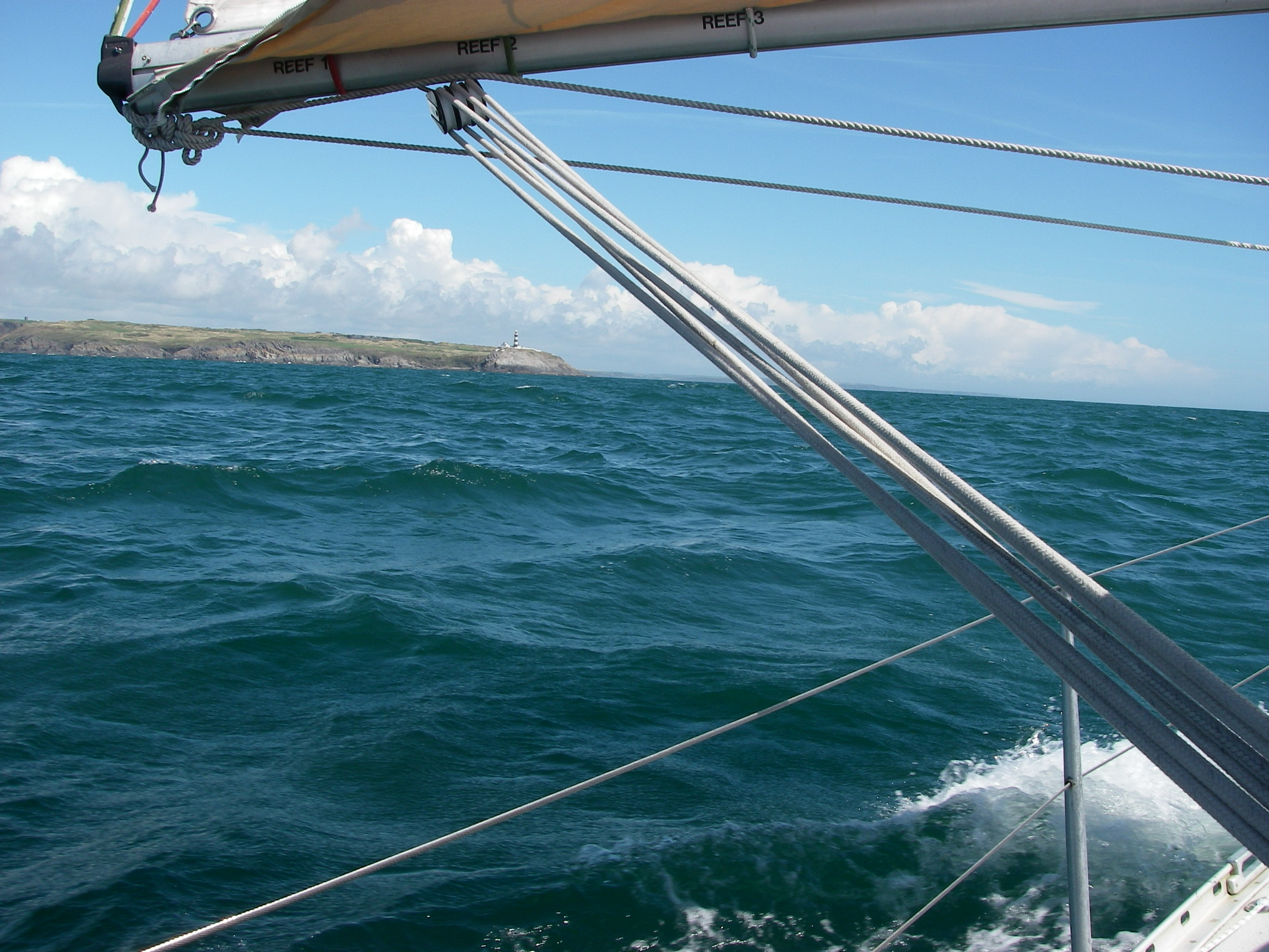 Up early at Castletownshend, perfect morning, still water, the sound of water falling in the woods, birdsong, a heron on the rocks: made tea and slowly to sea, admiring the pretty sunlit village. Fast reach in sun all the way to Kinsale, past the Old Head, with the wind gradually rising.
