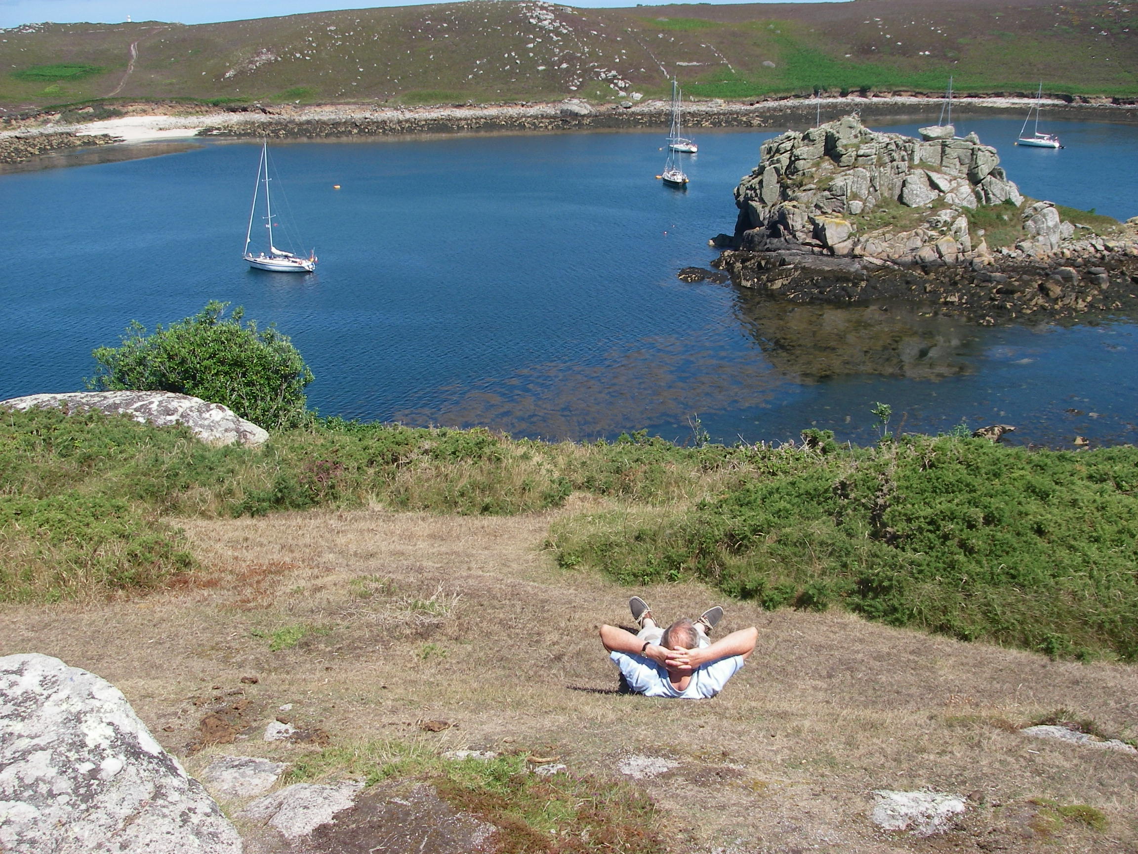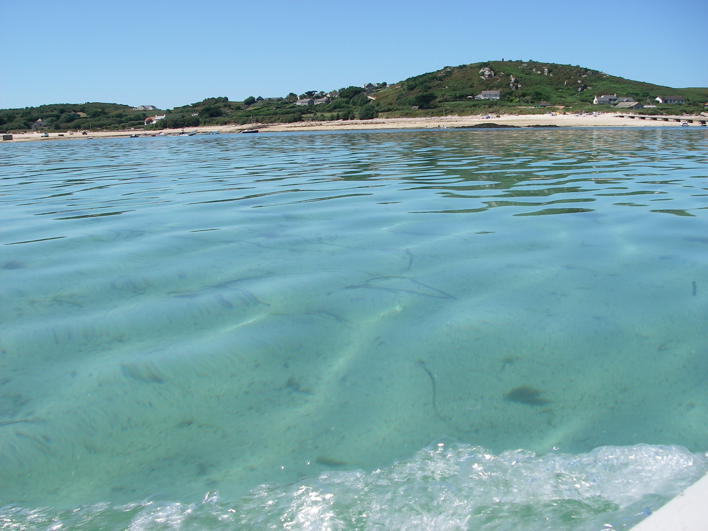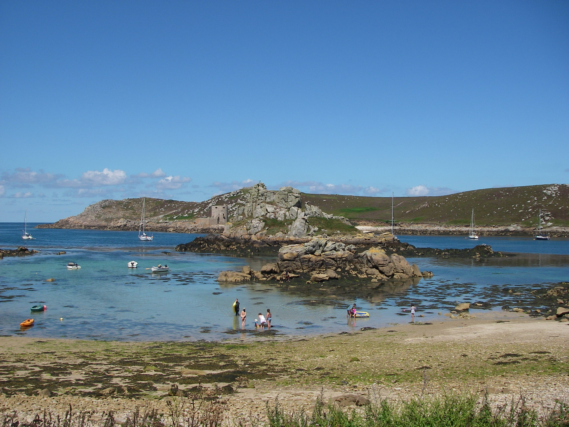 Motored over to Bryher in the dinghy for lunch, with a foot or two of water most of the way, because it was low spring tide.