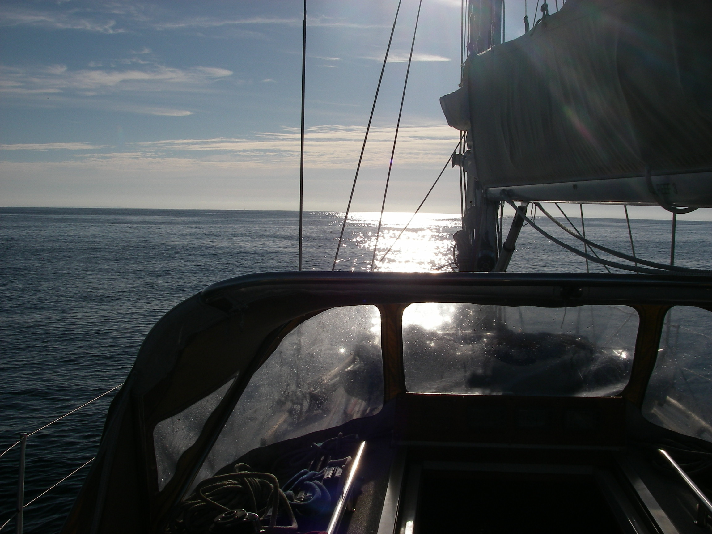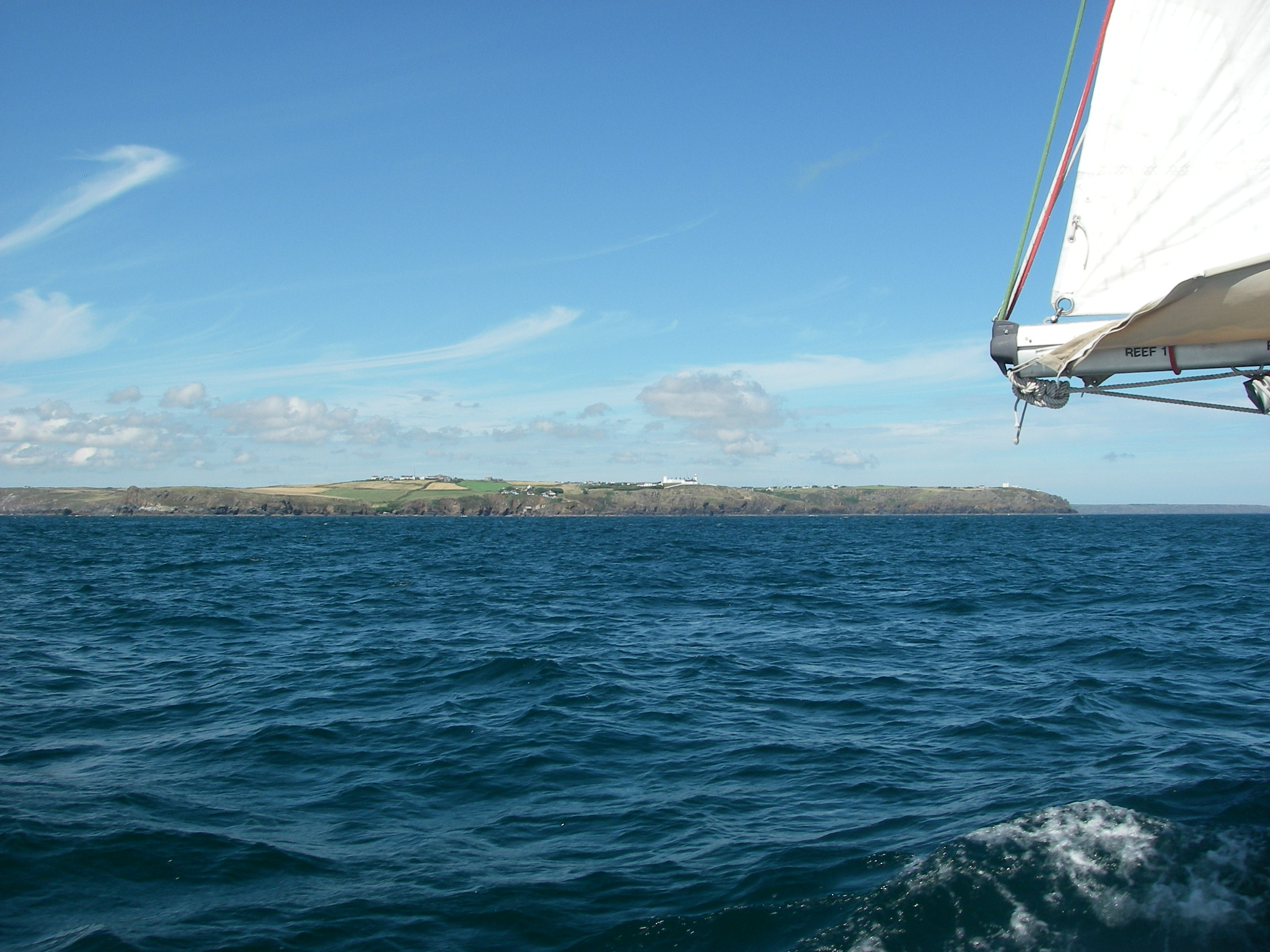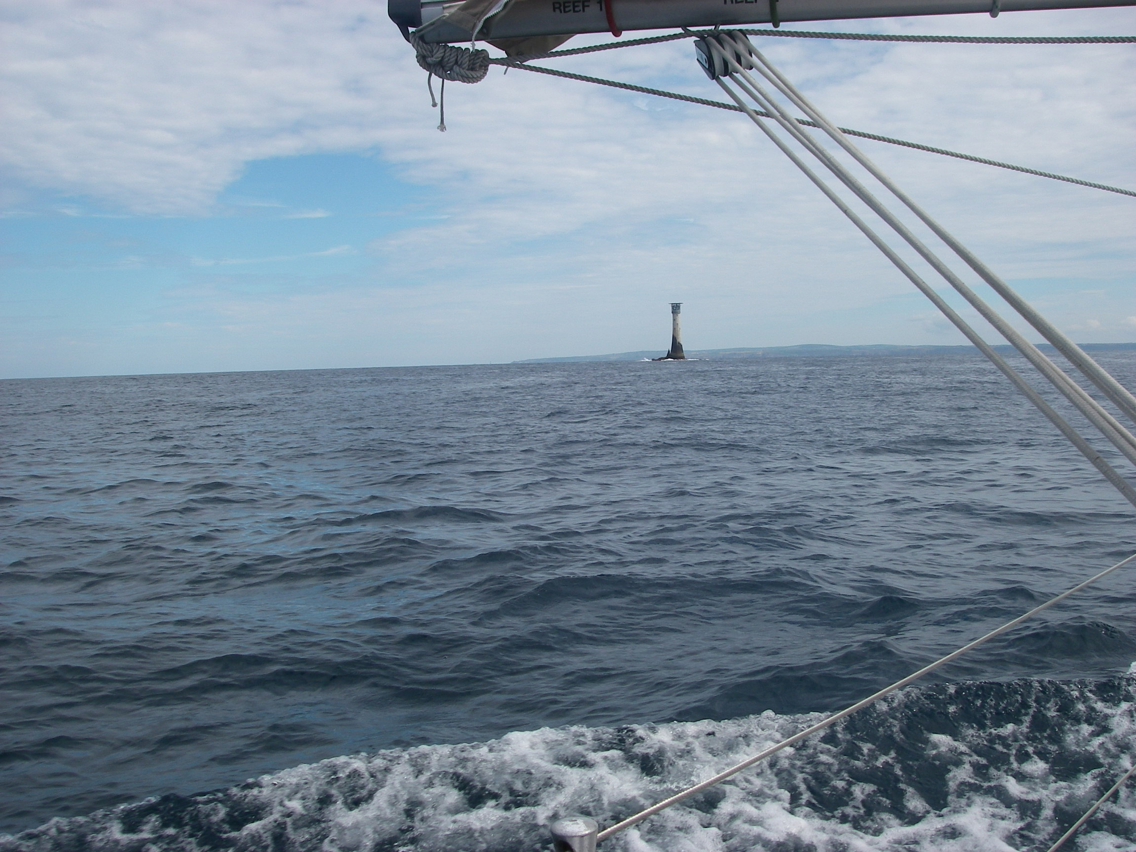 Perfect still morning, but forecasts says weather deteriorating. Left across Tresco Flats. Sun and light breeze to Lizard and beyond. Mobile reception so good out here we were able to check train fares on the web, book a Hertz car by phone instead, and reserve a mooring near Truro by email, all during the 60 mile passage. Passed close to Wolf Rock. Reached up past Manacles. Rain as we approached Falmouth Harbour. Dinner on board at Falmouth Yacht Haven.