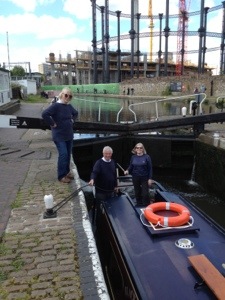Chris and David take us through the lock before Kings Cross. The preserved (and listed) gasometer is behind.
