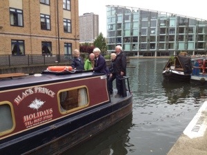 …and then lunch at the Narrowboat near City Road Basin, once a traditional pub but now a restaurant with bar. Here are five of the crew back in the cockpit getting ready to head for Hackney.