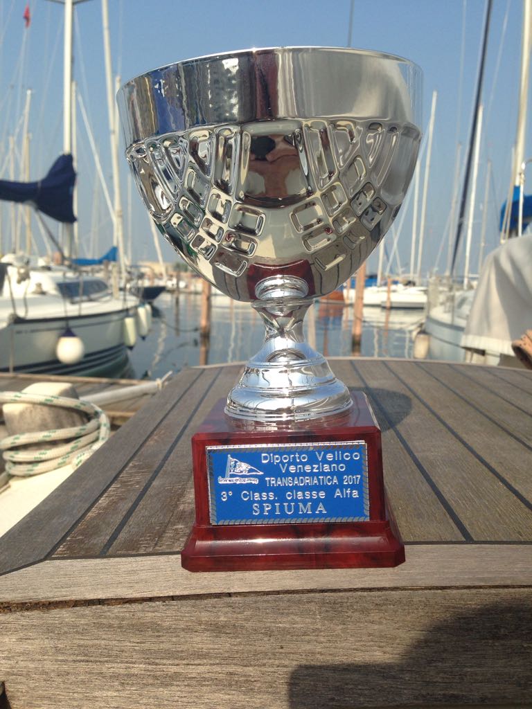 Delighted to be sent this picture of the cup for third in class in the 2017 Transadriatica race, especially since we were the smallest boat and the oldest crew.