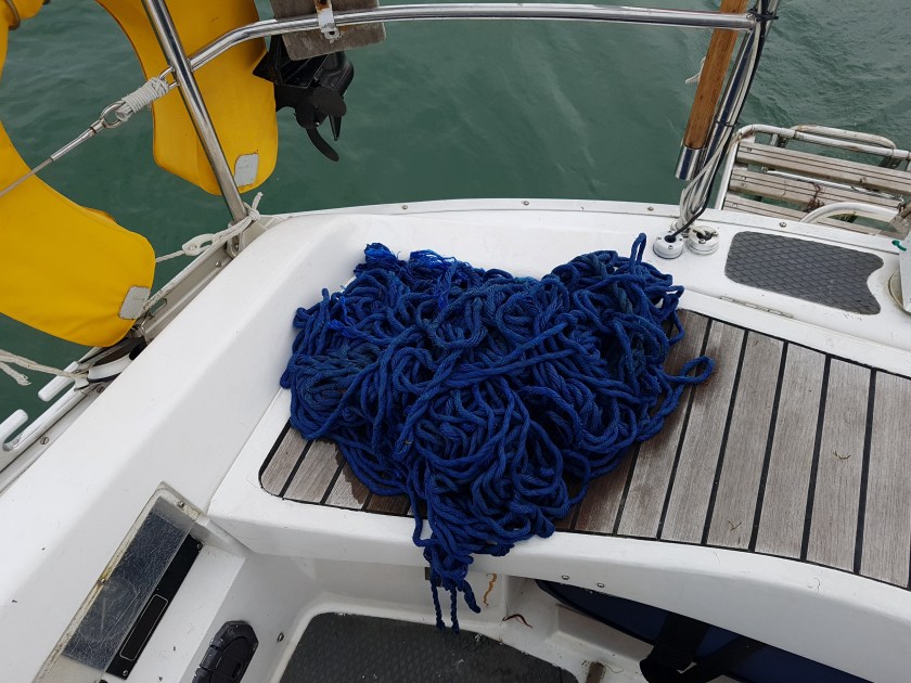 This time we had our own challenge even before we left the Solent when the propellor picked up this tangle of blue rope.