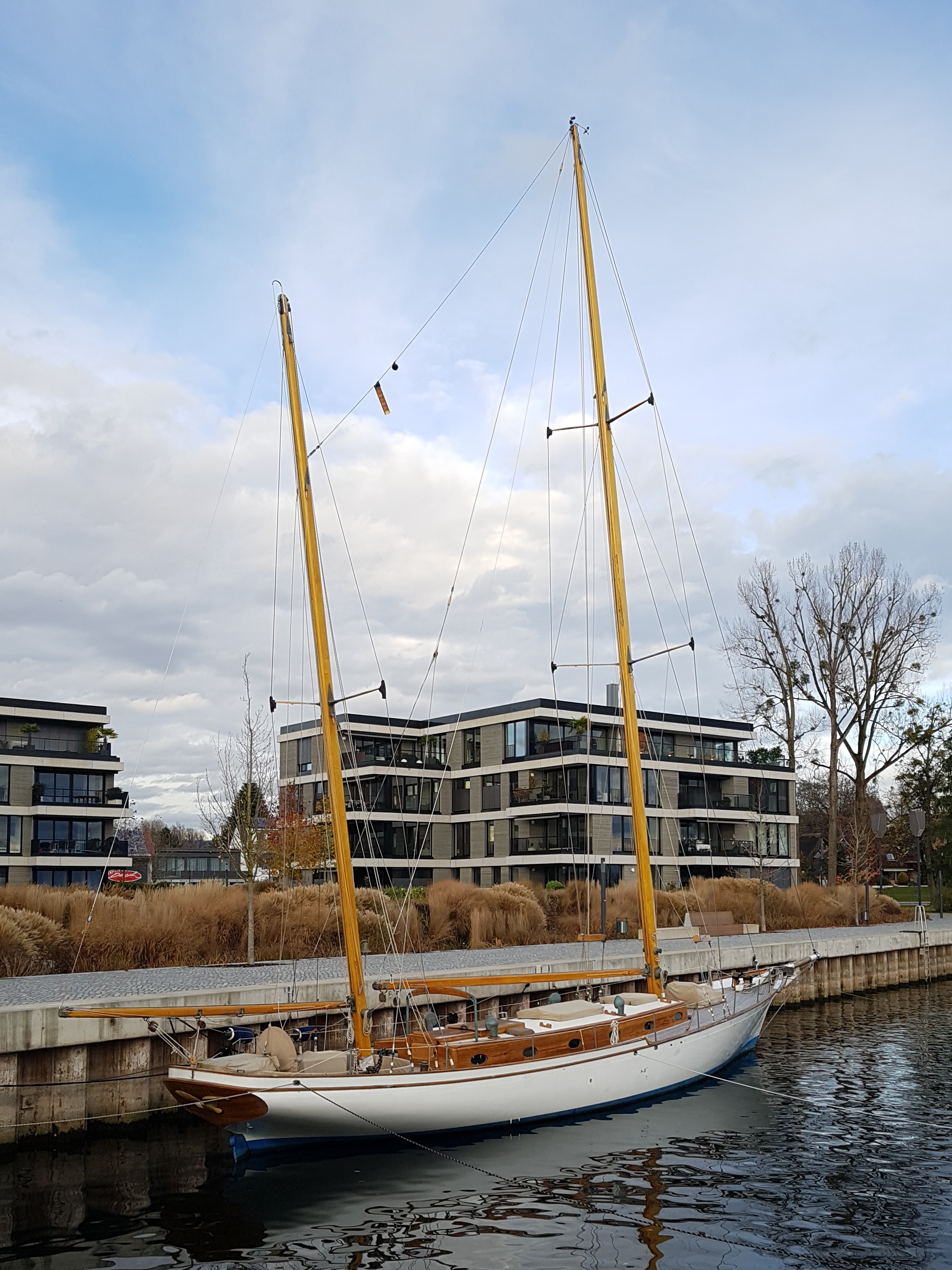 This beautiful 60 foot yacht called Tioga of Hamburg was moored at the end of November at Kressbronn on the German side of the Bodensee, or Lake Constance/Konstanz which is way up the Rhine, near where it starts becoming a mountain river, and well above the navigable section, so cut off from the sea. It is a US design from 1931 by the great Francis Herreshof, but the original was destroyed and this replica (or so we thought at first from Google) was built in 1988 in Maine and restored in north Germany, where it was recently for sale.