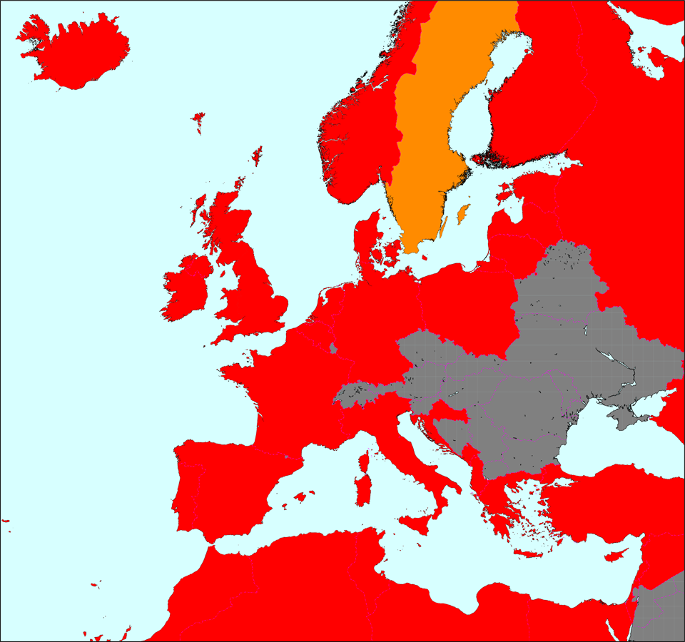 A map from the Cruising Association showing in red the countries where leisure sailing is banned because of Covid-19. Good news for Swiss lake sailing friends at least – no red there!