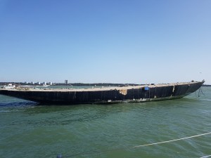 While this boat’s history is celebrated, there’s a yacht hulk moored on Southampton Water that intrigues me every time I pass on the ferry or in Spring Fever, from which I took the photo below. Or rather, I assume from the shape that this derelict vessel was a yacht, because it has the look and size of the J-Class built by the zillionaires of the early 20th century. I may be wrong about that, and will try to find out more.