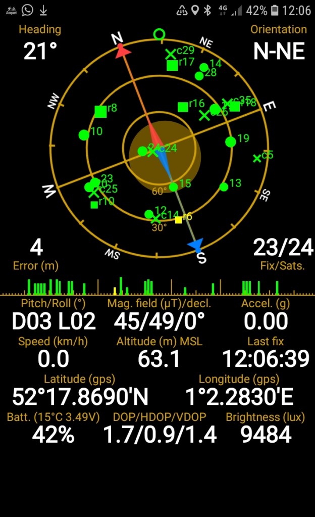 Centre left, near the grid of the sky, is the error measure in metres mentioned above. Bottom centre are more technical measures. The one to focus on is HDoP, which means Horizontal Dilution of Precision. A number of 1.4 is regarded as good, and anything below is better. This shows 0.9 at the moment the screen shot was taken. A double figure HDoP is bad.