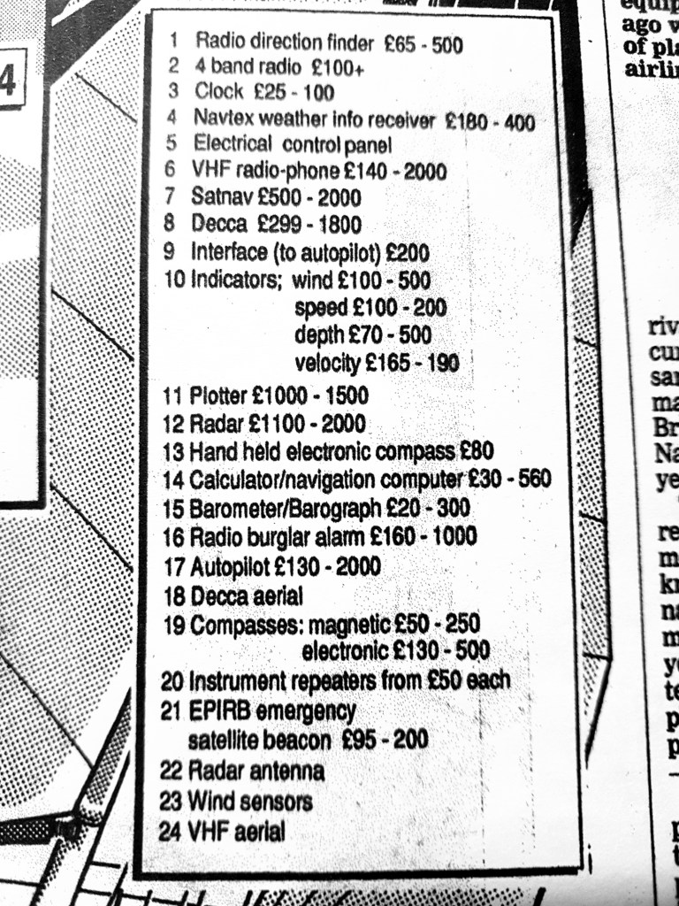 The list was part of an article I produced for the Guardian newspaper about electronics for small boat navigation, under the headline ‘And a satellite to steer her by’, researched by talking to manufacturers due to appear at that year’s London Boat Show. I had forgotten all about it.