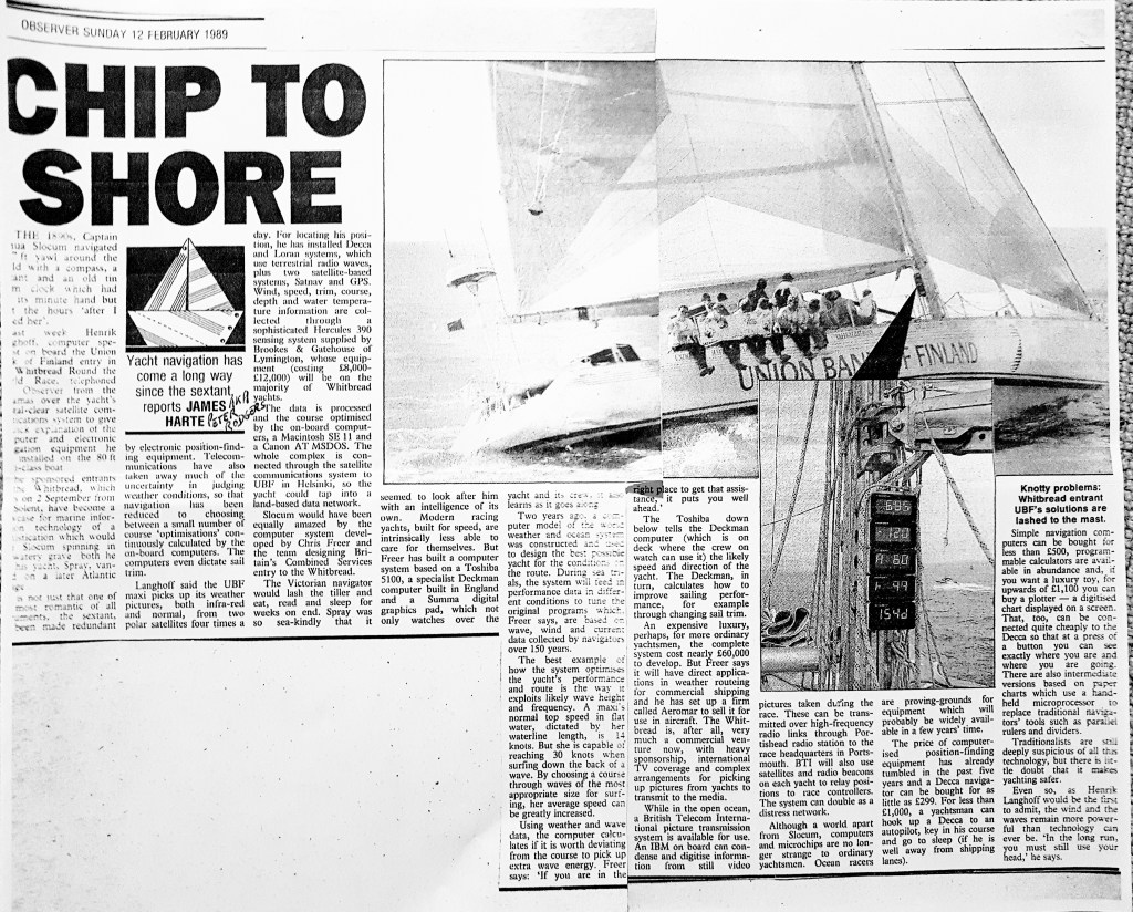 In the same folder I found an Observer article, headlined ‘Chip to shore’, in which I wrote about even more advanced electronic navigation equipment then coming into use. The piece was also part of newspaper coverage of the 1989 London Boat show. It described a £60,000 satellite-based navigation and weather routing system being trialled on a yacht in the Whitbread Round the World Race. It used both the old Satnav and the new GPS satellites.