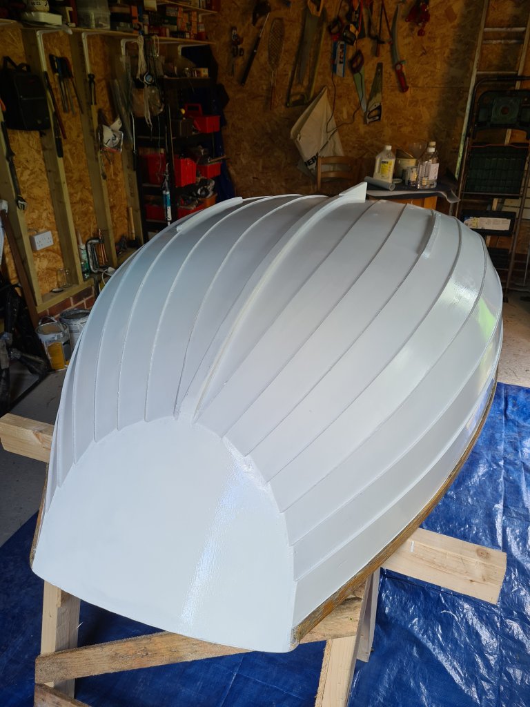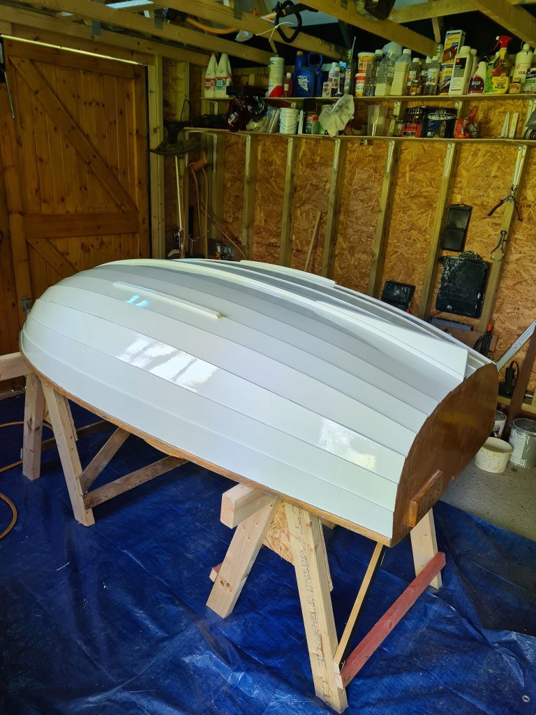 After 8 years kept in the open, the Iain Oughtred feather pram finally needed its paint refreshed.