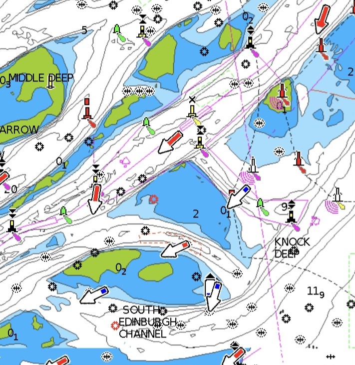 But the Edinburgh Channel filled up and is now a shallow and unbuoyed swatchway, as minor passages through the sands are called. The main ship channel is through the previously shallow small craft short cut, Fisherman’s Gat, which is now deep and buoyed.