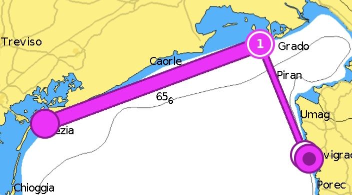 *In many EU countries, boats are licensed to sail up to a specific distance from shore, which is set according to their equipment. It seems the extra 9 miles is the result of an instruction that the course must stay within 6 miles of the Italian and Croatian shores. The background is that earlier this year, the organising yacht club, Diporto Velico Veneziano, was informed by the Croatian authorities that only boats with formal registration papers from their country of origin could compete. Catch 22: Italy has no registration system for boats under 10 metres, which meant that many members of the club could no longer compete in the Transasdriatica. The details of what happened next are not clear, but it seems that observing a 6 mile rule is part of a deal under which the Croatian authorities relented and allowed boats under 10 metres such as Spiuma to race there.
