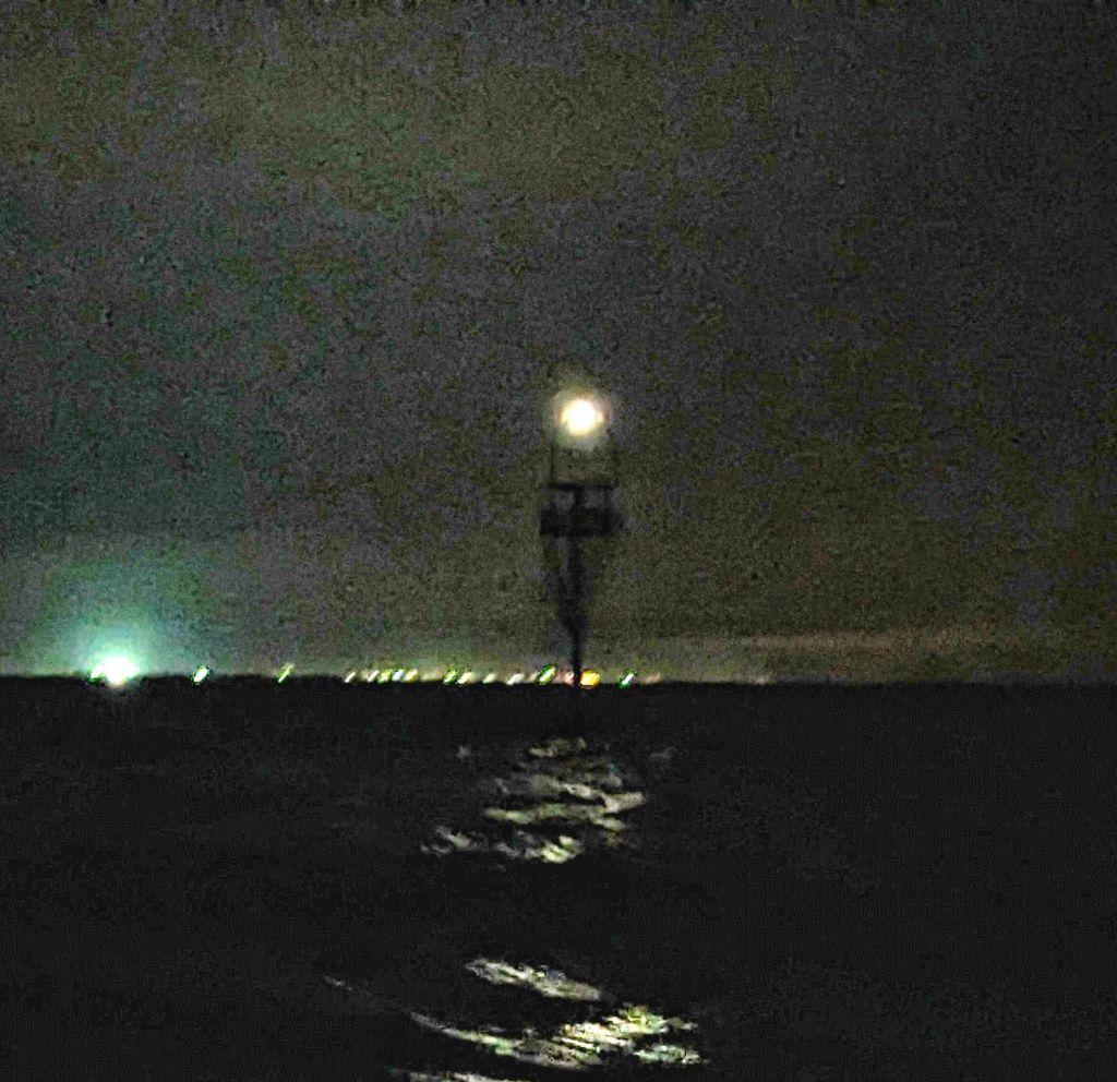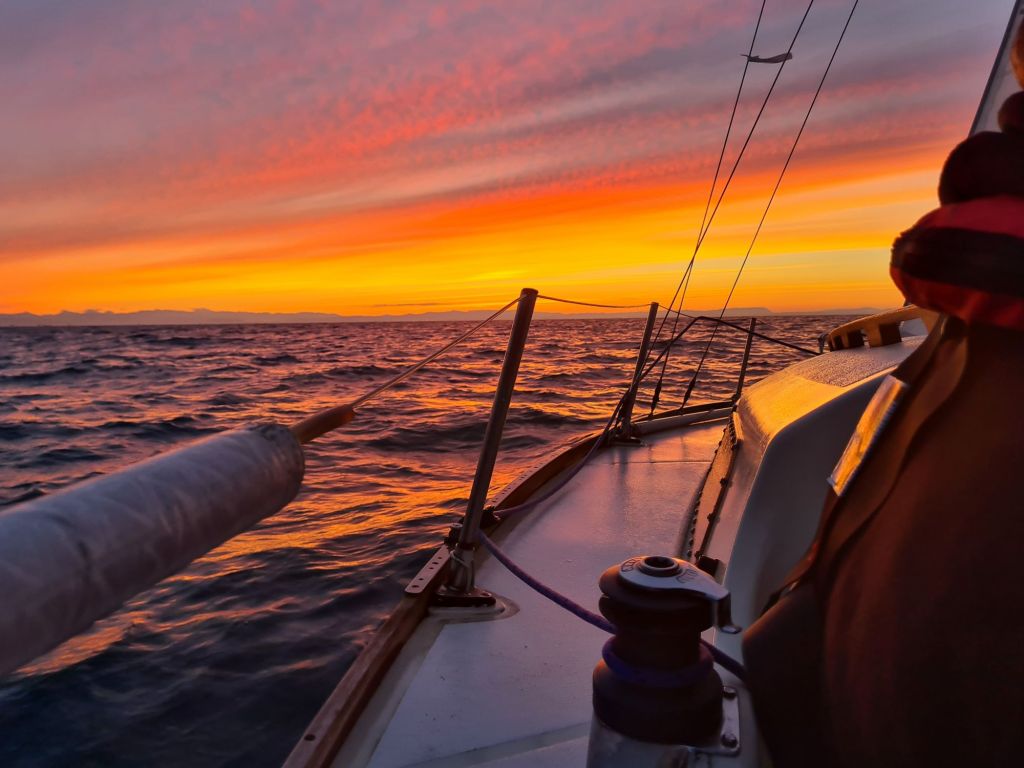 The race home started later that day, at 20.00, from a line just outside the harbour. This time, the wind was a steady Force 4 from behind. Spiuma does not have a spinnaker, which is vital for fast sailing when the wind is coming from right behind the boat. So instead we steered 30 degrees away from the line of the course on a reach, always the fastest point of sailing, knowing that the wind was forecast to move from south round to east later in the night. When it did exactly that, we were able to gybe the sail on to the other side, and continue on another fast reach direct to the beacon.