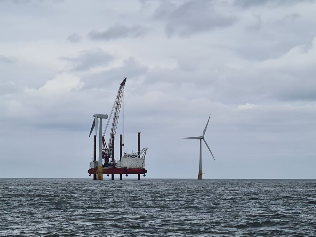A jack-up rig, with its feet planted on the seabed, ready to hoist a rotor onto a new wind turbine.