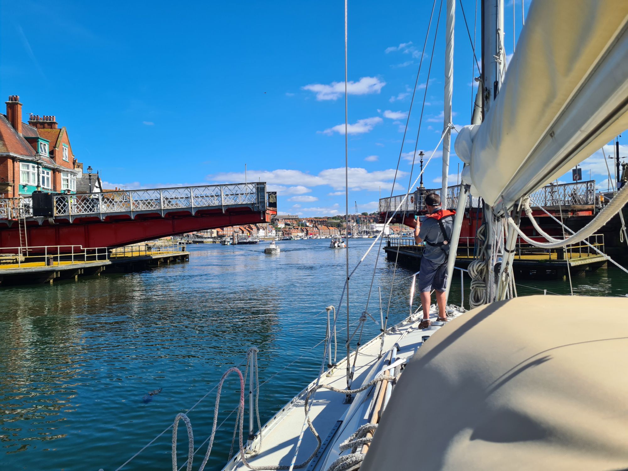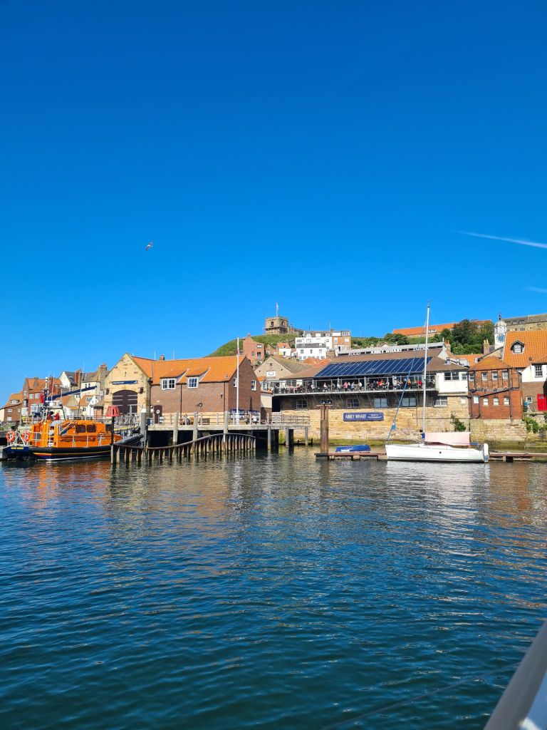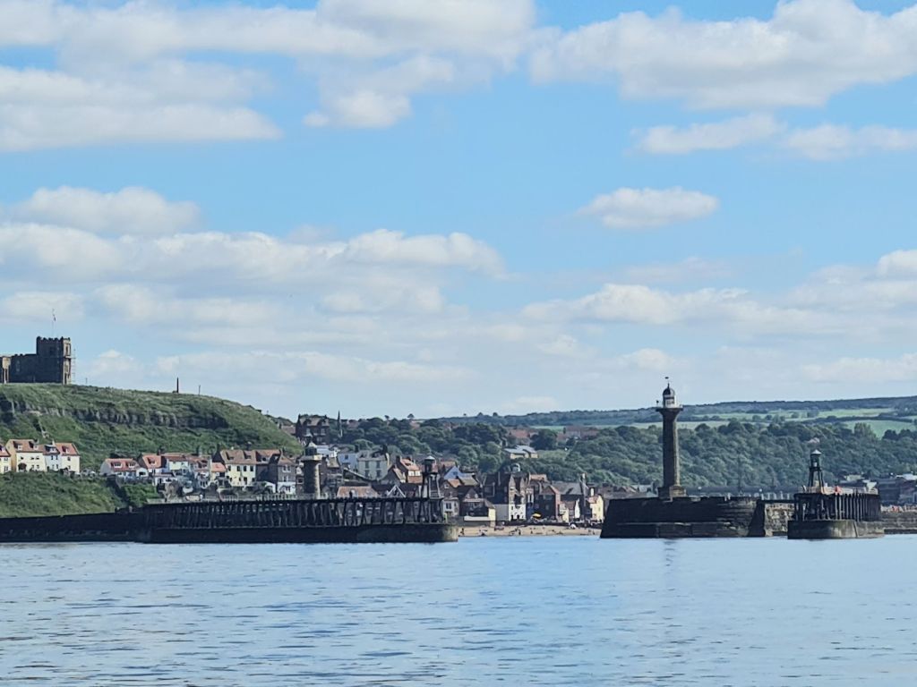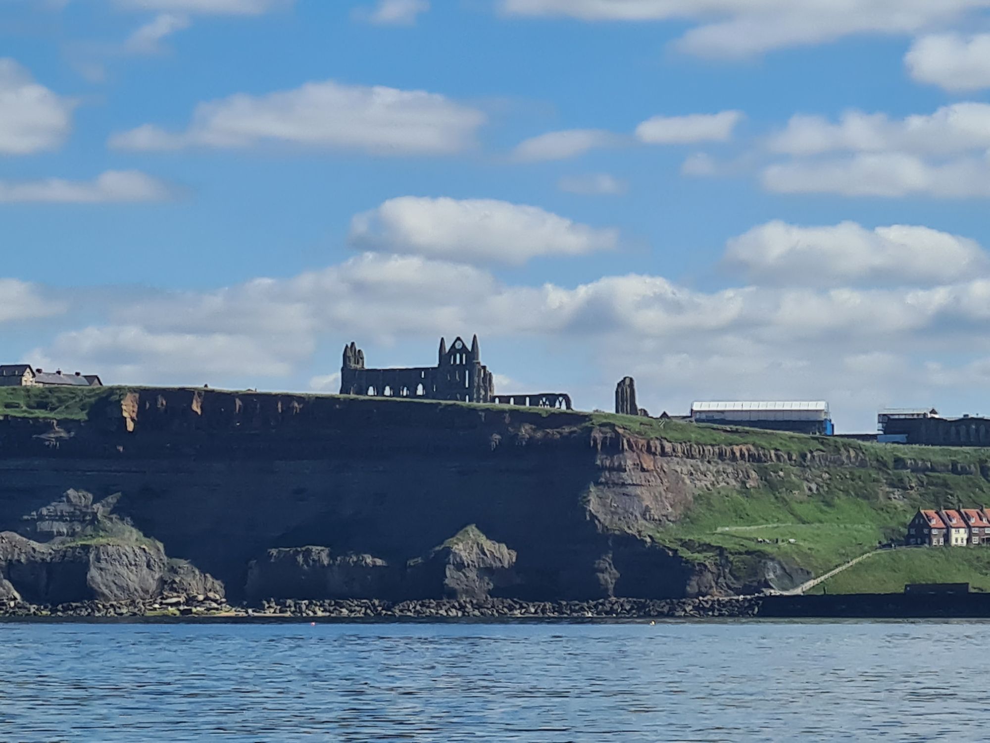 We passed Flamborough Head in bright sunshine, and approached Whitby Harbour carefully: the south-going flood tide we had at the time could push boats in the direction of a rocky ledge that runs out from the south side of the entrance.