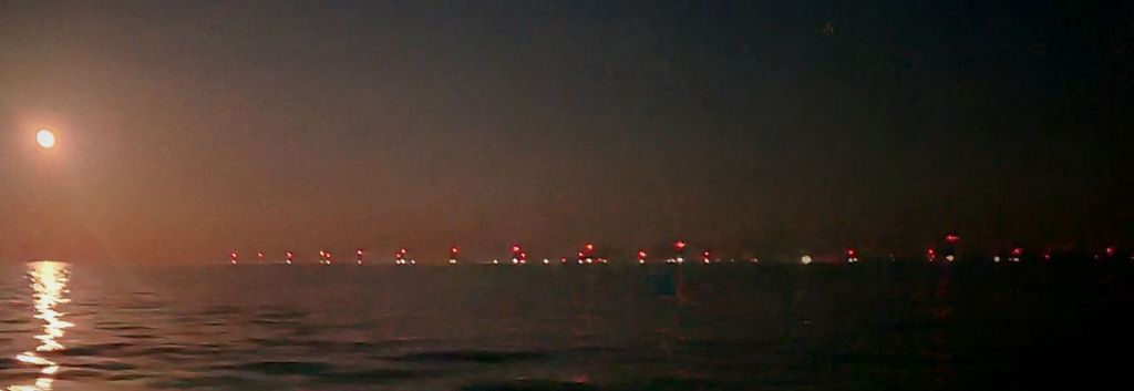 During the short midsummer night, the sea was lit by a full moon, with hundreds of red and white lights around us from wind farms and gas rigs. A faint glimmer from the sun stayed on the horizon all night, gradually shifting from north-west where it set to north-east where it would reappear.