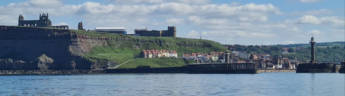 We passed Flamborough Head in bright sunshine, and approached Whitby Harbour carefully: the south-going flood tide we had at the time could push boats in the direction of a rocky ledge that runs out from the south side of the entrance.