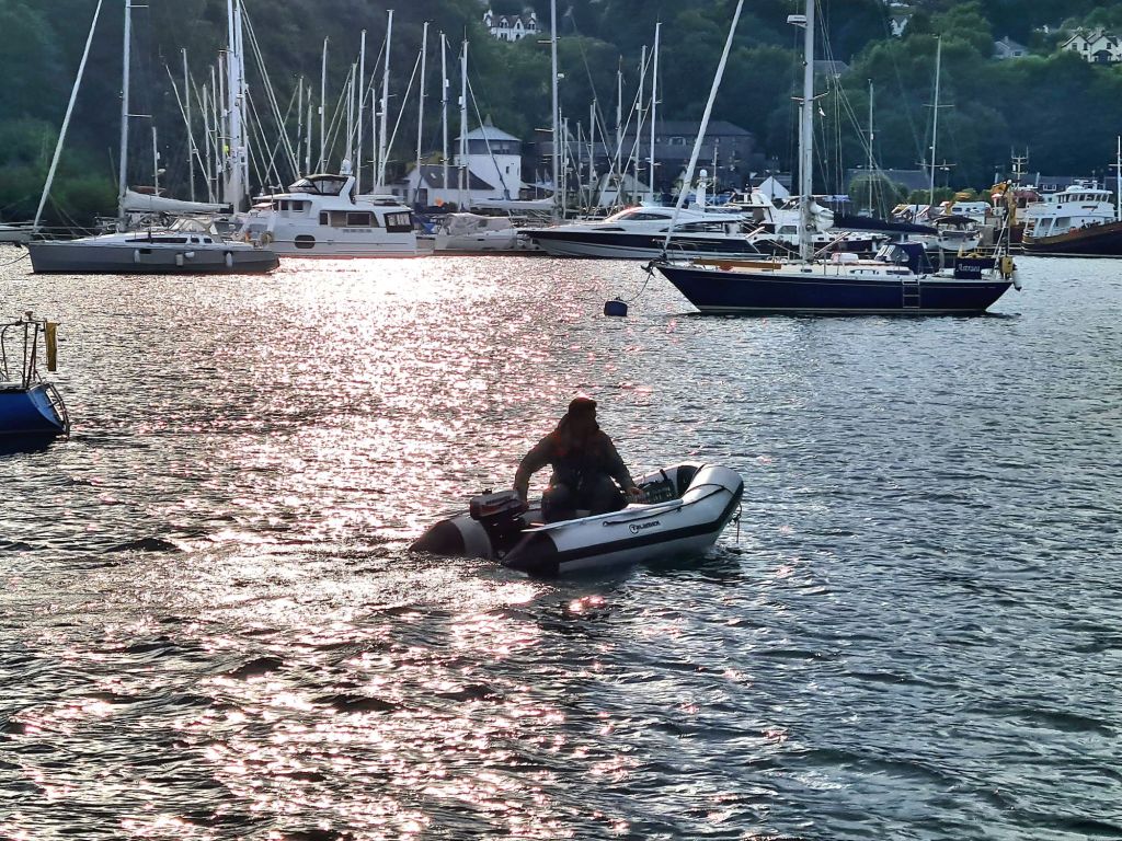 Leaving Kyle of LochalshLoch AlshThe start of Kyle Rhea is hard to make out until you are very near. It’s tucked into the dip between the two hills, and bends immediately out of sight to the left. The tide runs at 8 knots at springs, creating whirlpools, though we were going through at neaps, so it was relatively sedate. We used a back eddy just inside the entrance to make way against the last of the tide against usThe Sound of Sleat, after passing through the narrows, was sunny but suddenly coldThe Cuillin Hills of Skye appear round the Point of SleatThe Cuillins from near the island of RumRum, a wild and mountainous island with a small settlement and a large population of deer. We passed close by on the way to the smaller island of CannaThe Small Isles, clustered south of Skye. When sailing near Canna in good visibility, Skye, Rum, Eigg, Muck, Mull, Coll and the outer Hebrides islands of South Uist and Barra are all visible, and possibly Mingulay, though it was hard to be sure of the latter.It’s like an inland sea.Map: Clyde Cruising Club.Evening arrival in the sheltered harbour of Canna.Leaving Canna next morningThe lighthouse on Ardnamurchan Point, the island of Eigg in the backgroundA CalMac ferry from Oban to Castle Bay on Barra in the Outer HebridesTobermory , where we picked up a visitor mooring in the bay and went ashore by dinghyTobermory’s colourful waterfront next morning. The yellow building is the locally famous Mishnish pub and folk music venueOur new dinghy proved its worth – larger, more stable getting in and out, easier to row and motor because it has an inflatable keelClose encounter with Tobermory lifeboat – we were involved in a joint RNLI/Coastguard training evening. The lifeboat came expertly alongside us and took off one of our crew members, who we picked up later from the coastguard by dinghy.