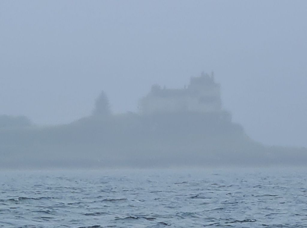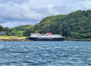 We kept a strict look out through the murk for ferries and saw several emerge. After crossing the Firth of Lorn, we crept round the edge of the narrow entrance to Oban Bay, as strongly advised by the harbourmaster. Oban is the main hub for the Caledonian MacBrayne network of ferries to the islands. They pop out suddenly from behind a hill as you enter from the other direction.