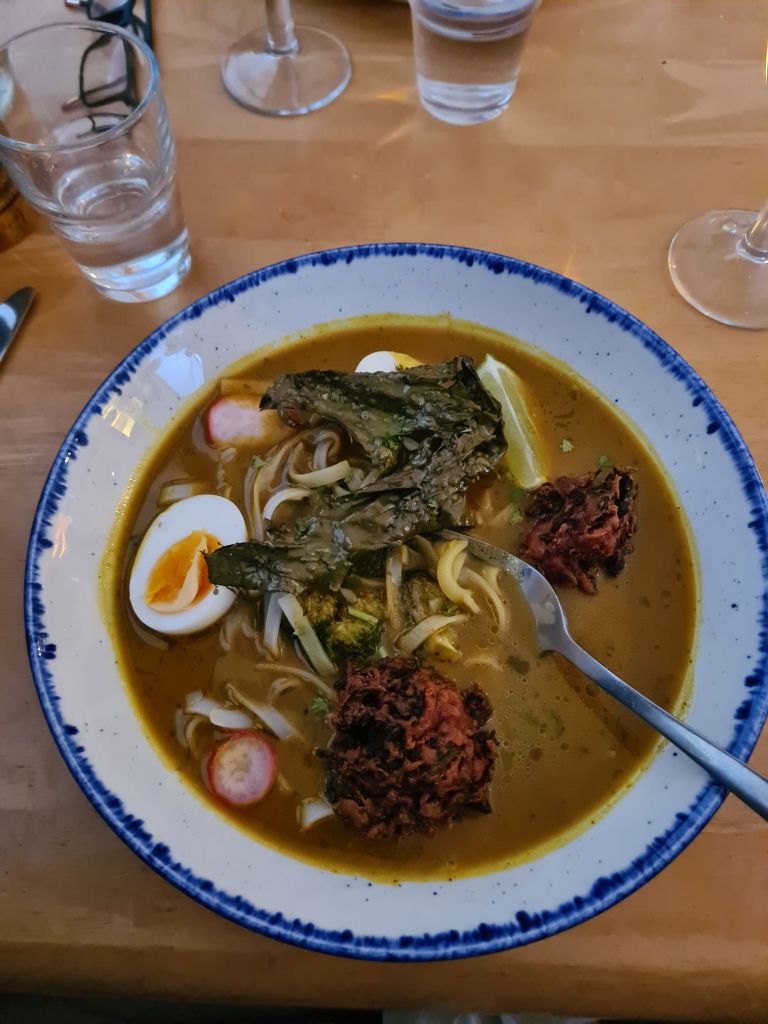 My spicey egg laksa with dulse (a seaweed) croquettes and kelp. The starter was fritters of kelp with another plant called sea spaghetti (because that’s what it looks like).