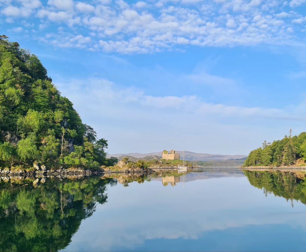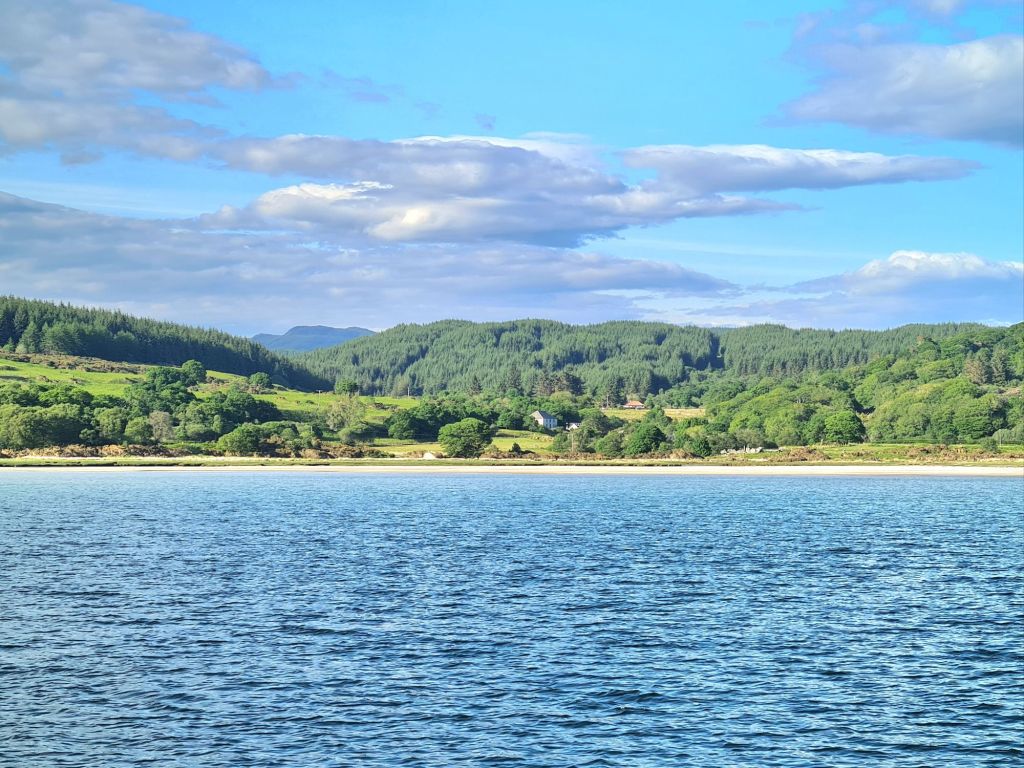 Spring Fever is anchored in the distance, just in front of the small island in Loch Moidart