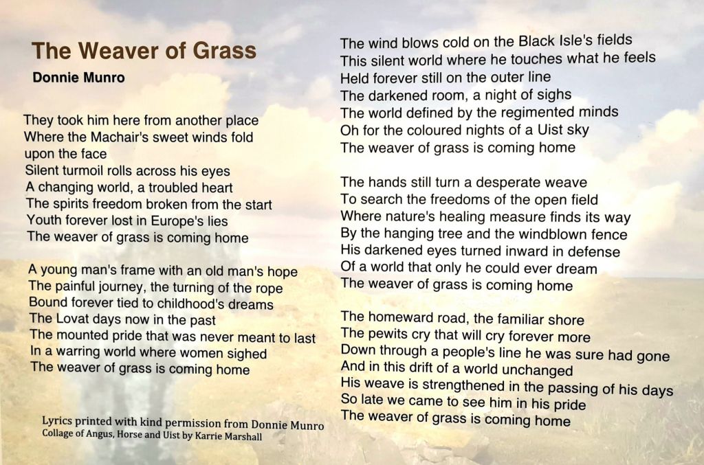 It includes a touching connection with modern Scottish culture in the words of a song by Donnie Munro of the ’90s band Runrig. It’s called The Weaver of Straw, and is about Angus MacPhee, who came back to South Uist so traumatised after serving in the army in WWII  that he never spoke a word for 50 years. His sole pursuit was weaving straw into familiar and fantastic shapes.