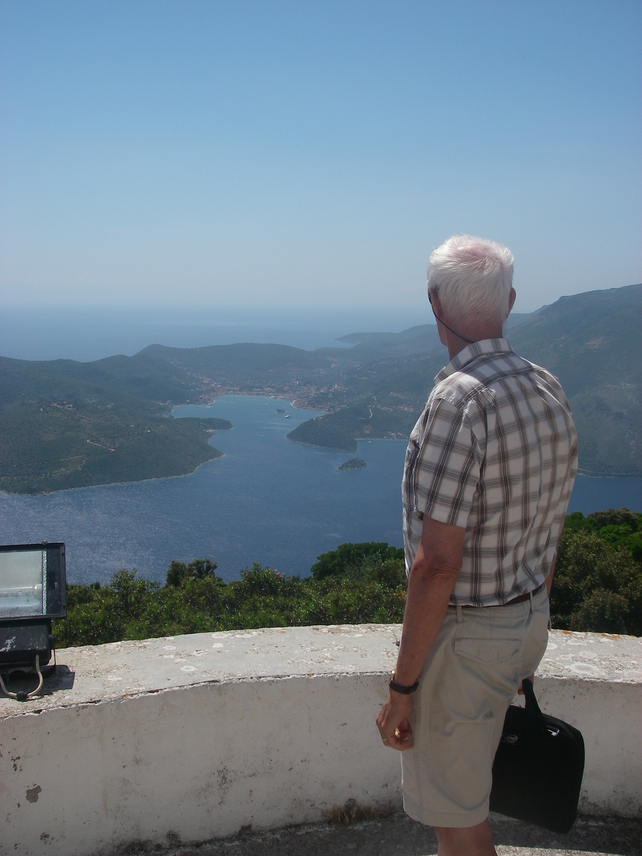 Martin looking towards Vathi, the main town of Ithaca, at the head of the deep bay in the distance.