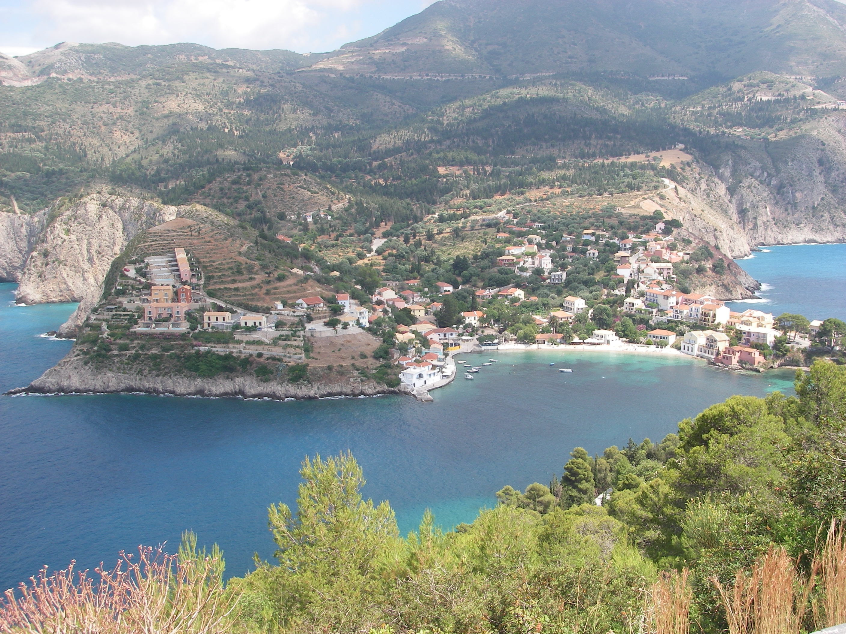 Vathi, the main town of Ithaca, at the head of the deep bay in the distance.