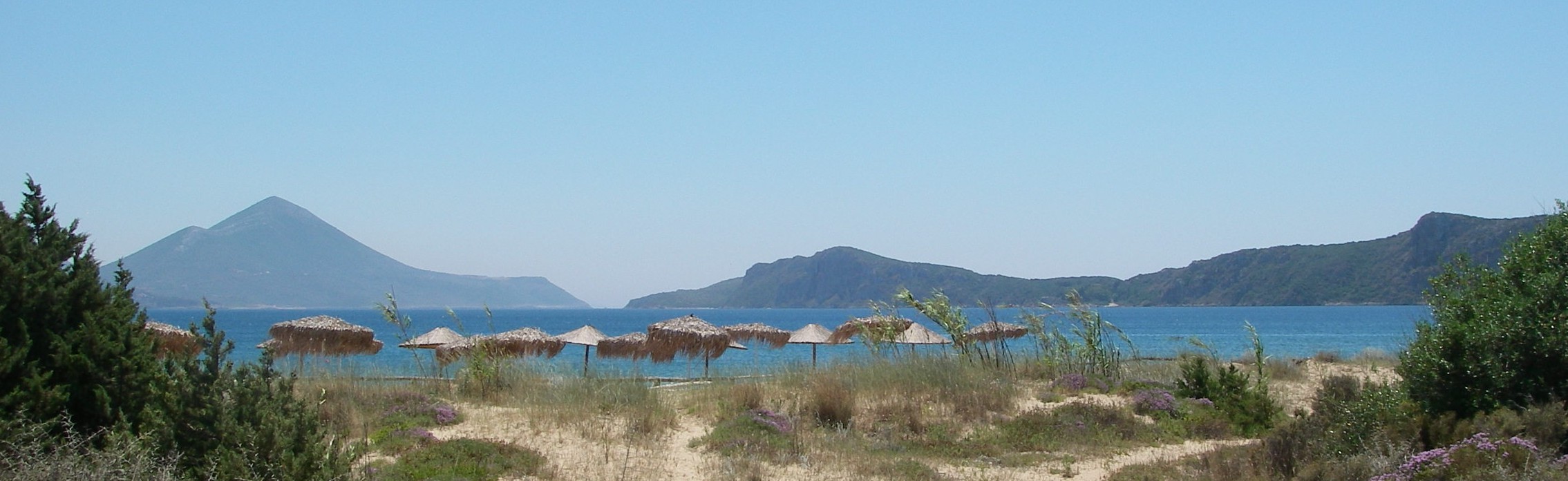 Low dunes behind a long sandy beach, north end of Navarino Bay, whose entrance is the just-visible gap in the distance.