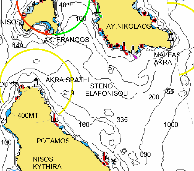 Cape Malea, top right; the island of Kythira, bottom left; the little island of Elafonisos, top left, which provides a sheltered anchorage when it is too dangerous to round the Cape.