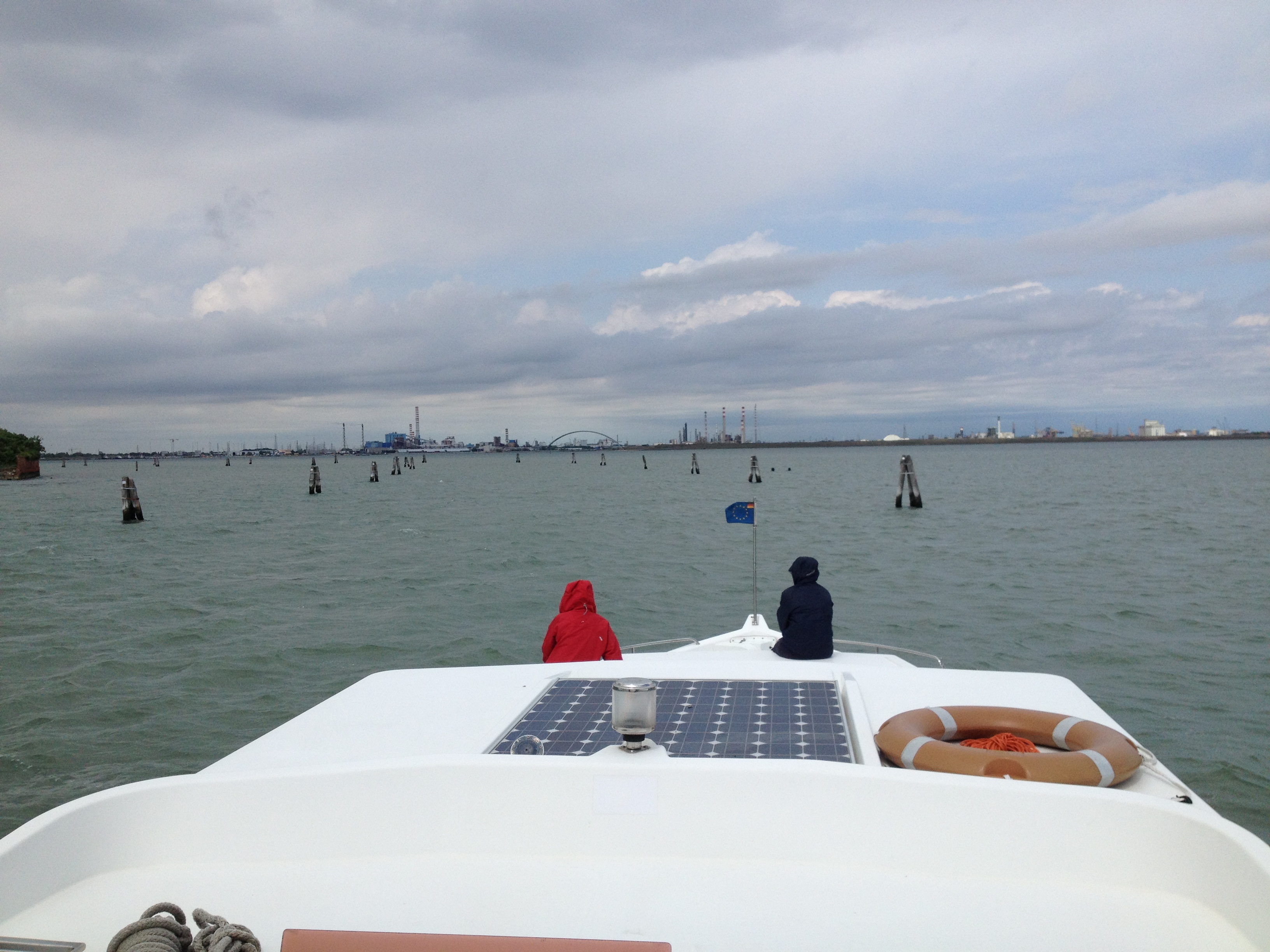 Heading towards the Brenta entrance, Marghera to the right.We had time only for the lower reaches of the Brenta, which are not particularly attractive, because the industry and power pylons of Marghera are so close.