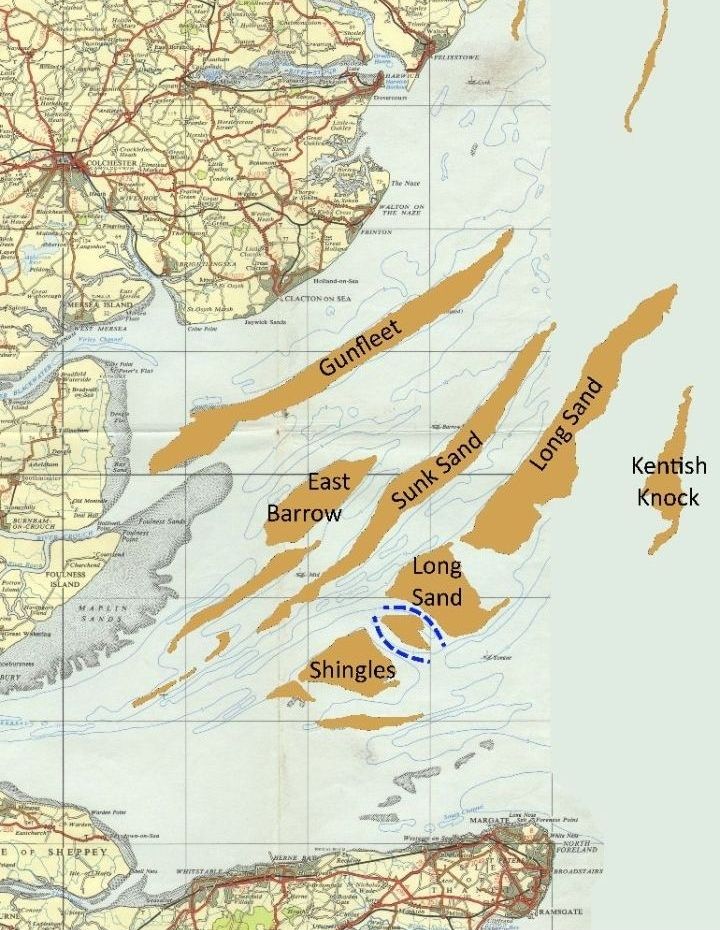 The Thames Estuary is fascinating, though it needs a bit of imagination and a chart to see why, because the surrounding land mostly looks low and featureless from the sea. The estuary is packed with long finger-like sandbanks pointing mainly north-eastwards, so that crossing it in a small boat is like threading through invisible islands, finding short cuts, guided by a large number of buoys and beacons.