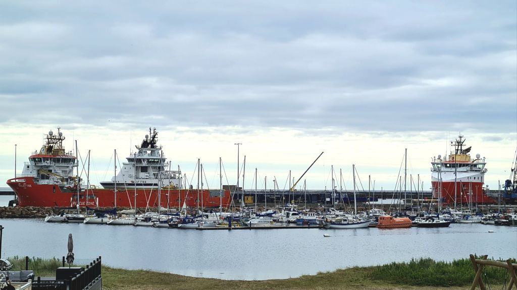 It’s a fishing village with modern quays and warehouses that have seen more prosperous days. There are two good cafes and a shop, and a pontoon for visiting yachts where we moored after much the best sail we have had on this cruise.
