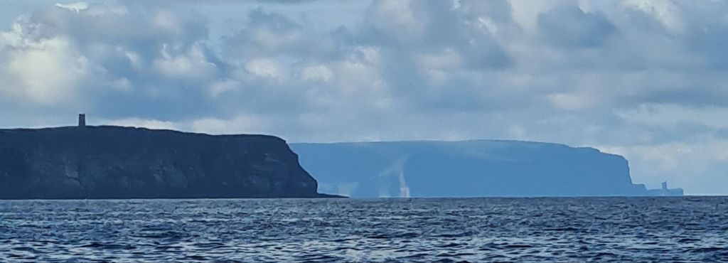 The Cape is so prominent we could see its outlines in the distance hours before we arrived. Wrath actually means turning point in Old Norse, but the cape is well known for angry seas, and sudden changes of weather. There’s not much between the north-west corner of Scotland and the Arctic. The cliffs as you approach the Cape from the North East are spectacular; the Cape itself was in sunlight as we rounded it.