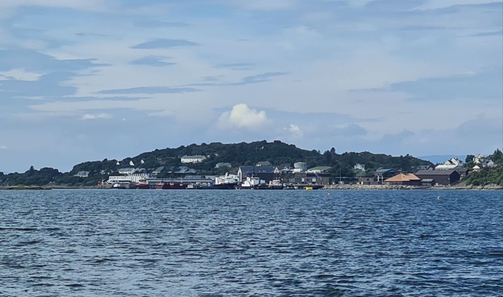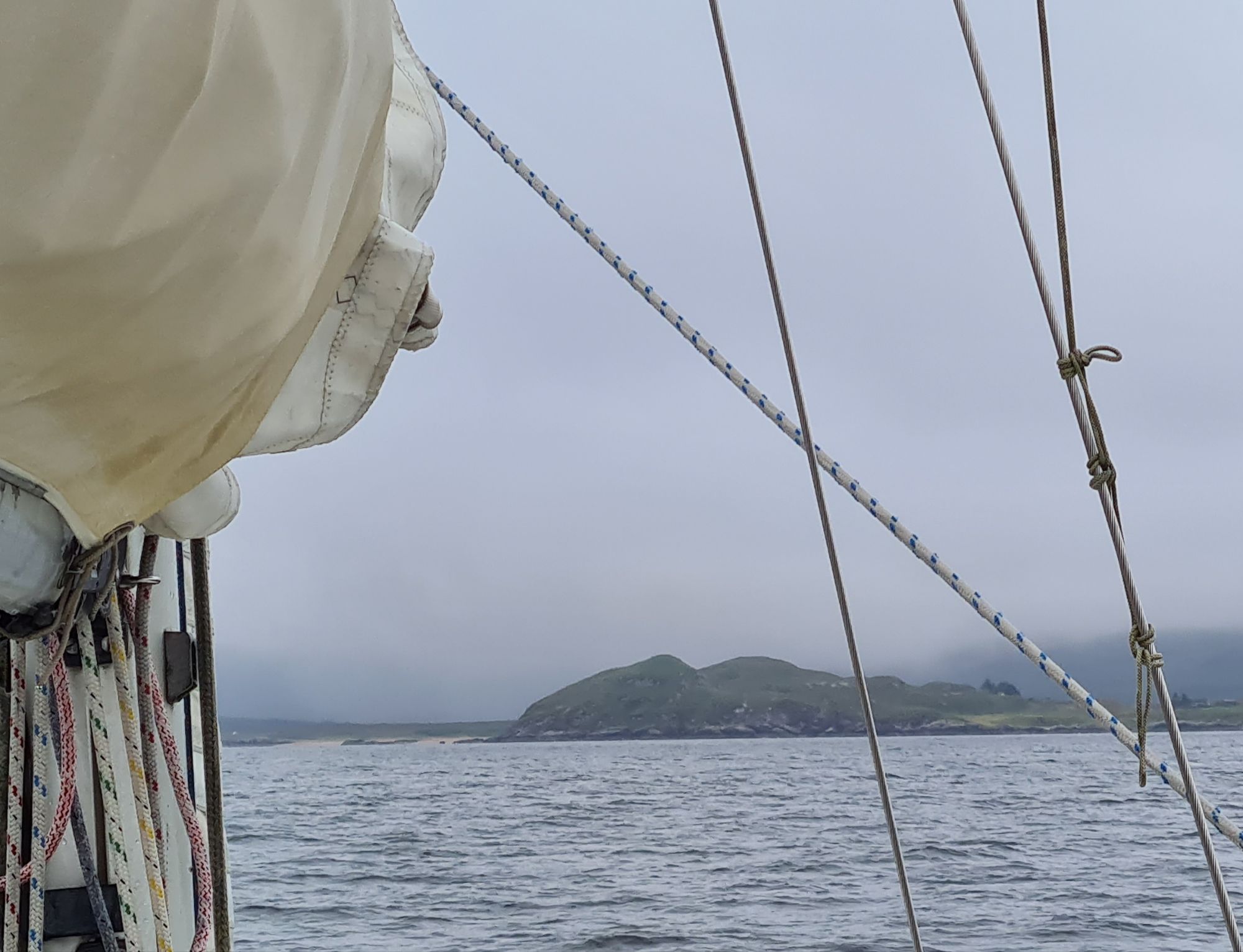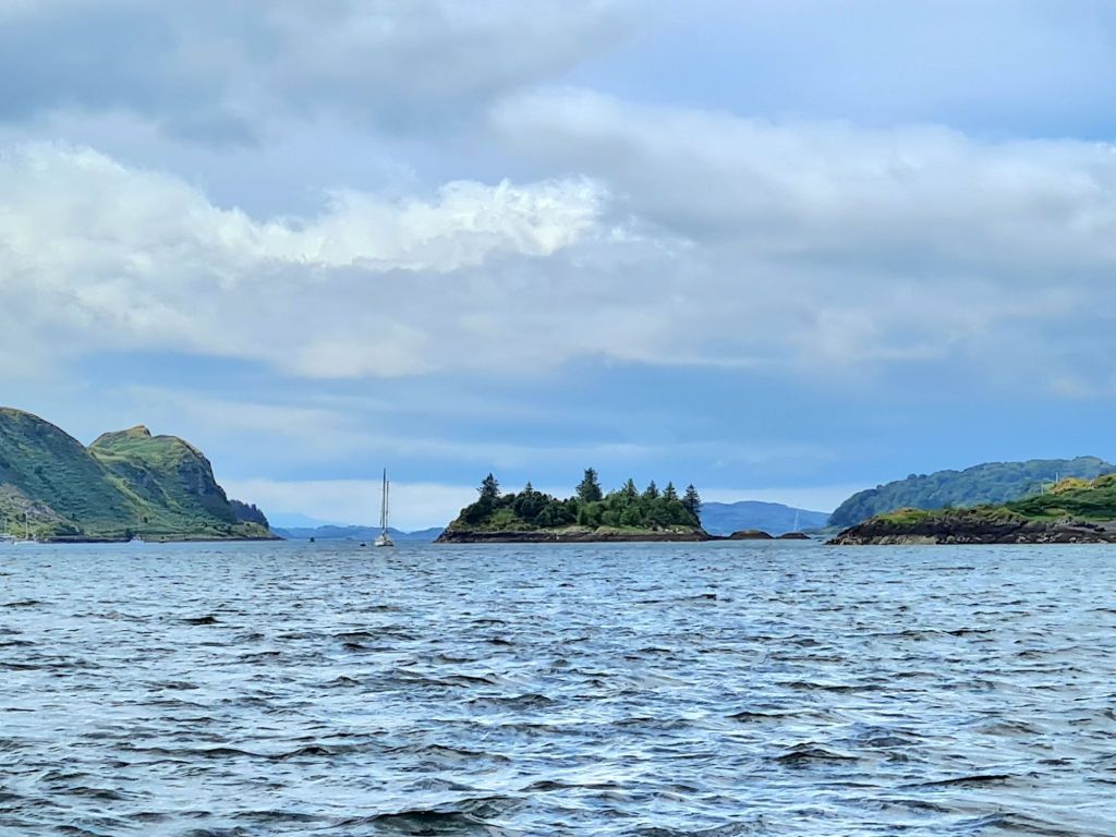 We left Tobermory on a grey day, with wind blowing from dead ahead along the Sound of Mull and rain clouds chasing each other across the sky. It was a wet and blowy last 25 miles to our destination, the island of Kerrera on Oban Bay, where we’ve rented a mooring for a year.