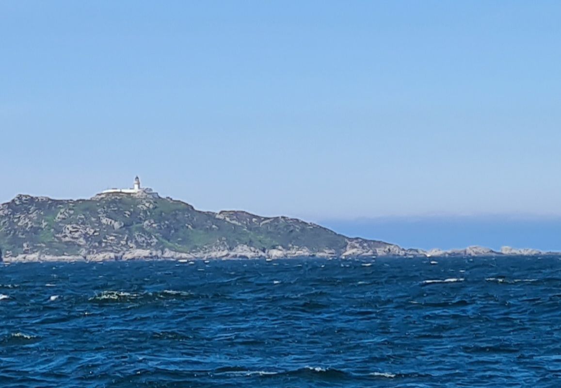 Once out at sea, we motored for the first few hours of a 16 hour passage until the wind gradually built up through Force 3 to Force 5. With the engine off, we were tearing along at 7 to 9 knots over the ground, helped much of the time by a west-going tide. We had the mainsail double reefed to ease steering. Later, the wind reached Force 6.