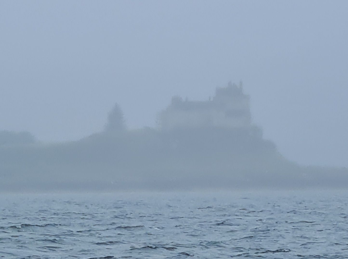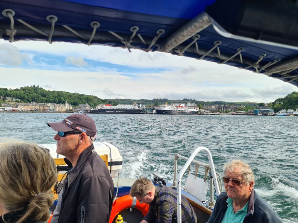We kept a strict look out through the murk for ferries and saw several emerge. After crossing the Firth of Lorn, we crept round the edge of the narrow entrance to Oban Bay, as strongly advised by the harbourmaster. Oban is the main hub for the Caledonian MacBrayne network of ferries to the islands. They pop out suddenly from behind a hill as you enter from the other direction