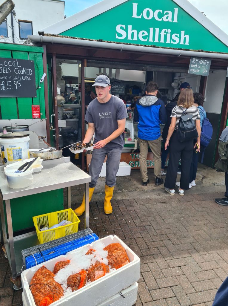 The stall sells perfectly cooked local mussels to eat standing up or on benches on the quayside. There were scallops, oysters, dressed crabs, langoustines, clams, lobsters, whelks, salmon poached and smoked – all local and cooked in the shed behind or sold raw