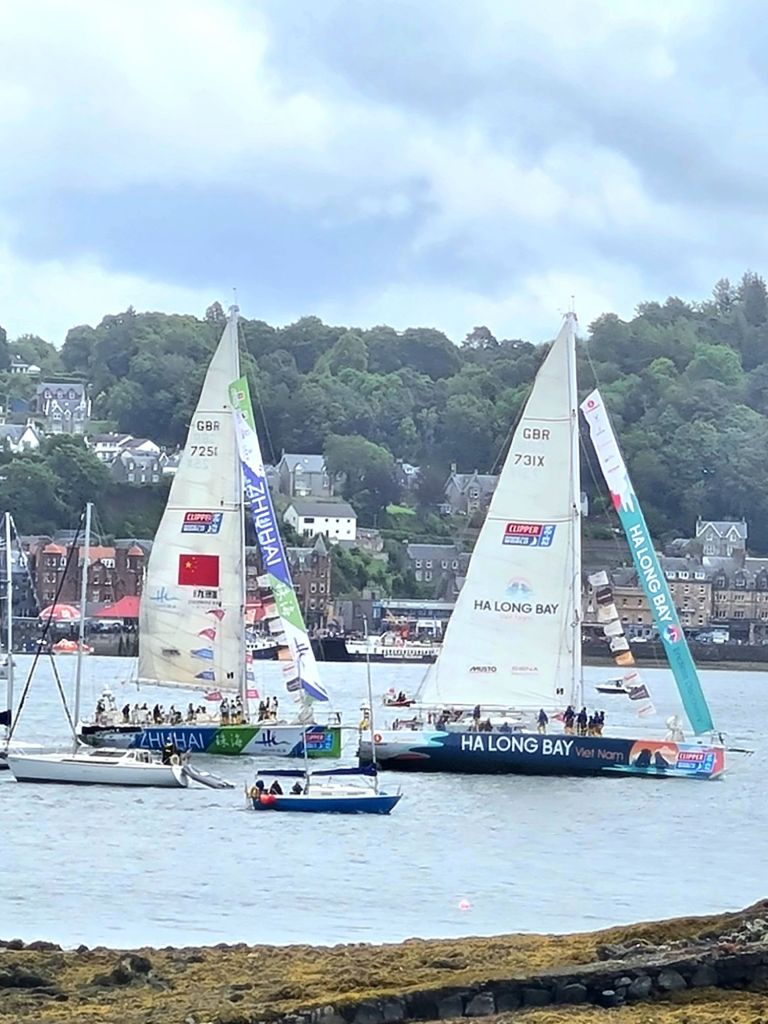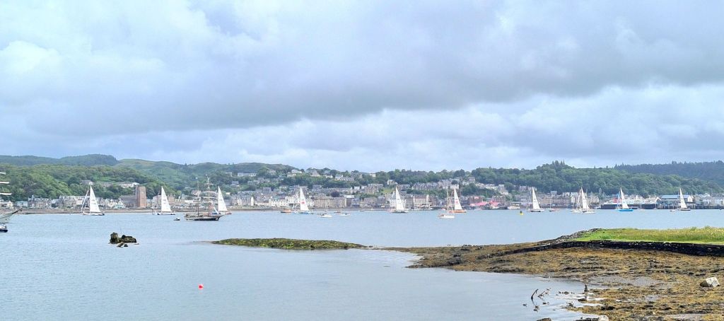 That meant I was there for the departure of the Clipper Fleet, which formed up for a follow-my-leader circular sail round the bay, then a sail past the crowds looking on from the town, then exit from the bay in line astern. The actual race start was just outside in the Firth of Lorn