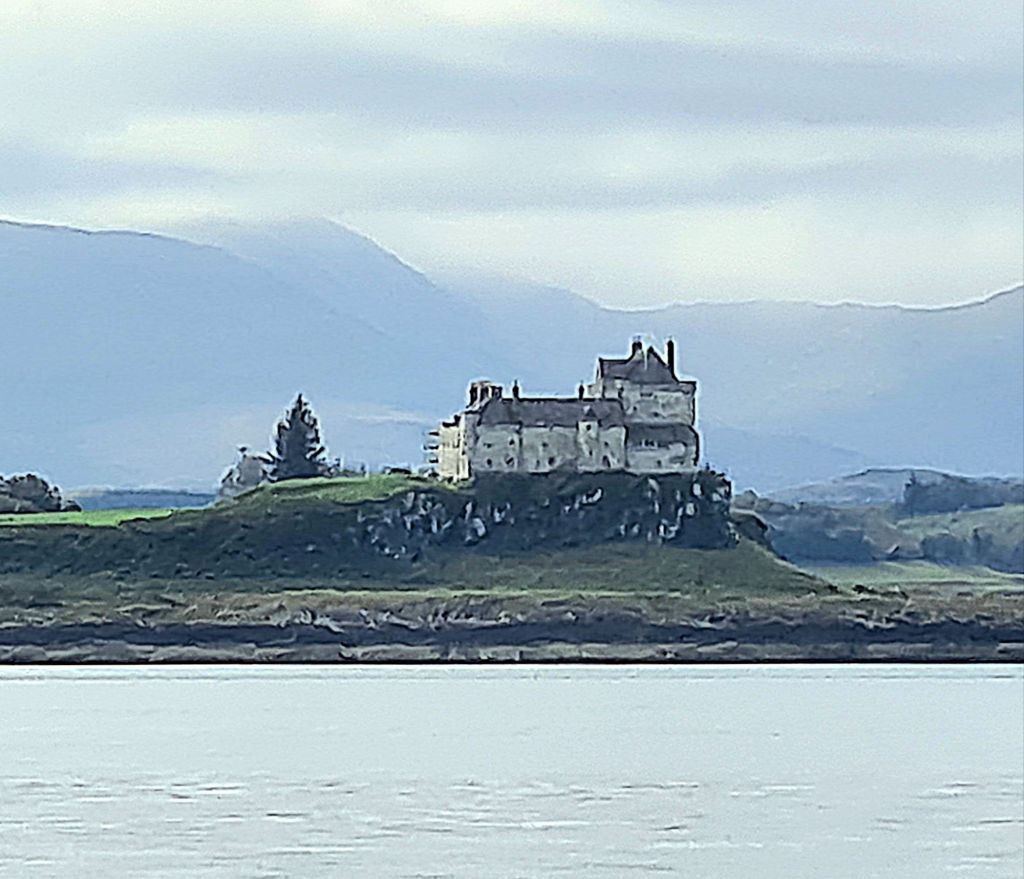 Duart Castle, at the entrance to the Sound of Mull, looms through the rain as we pass.The laird of Duart was due to preside that day over Mull’s annual Highland Games