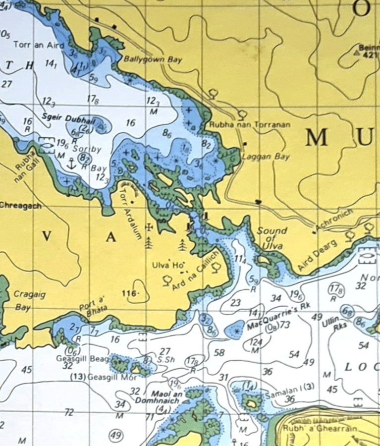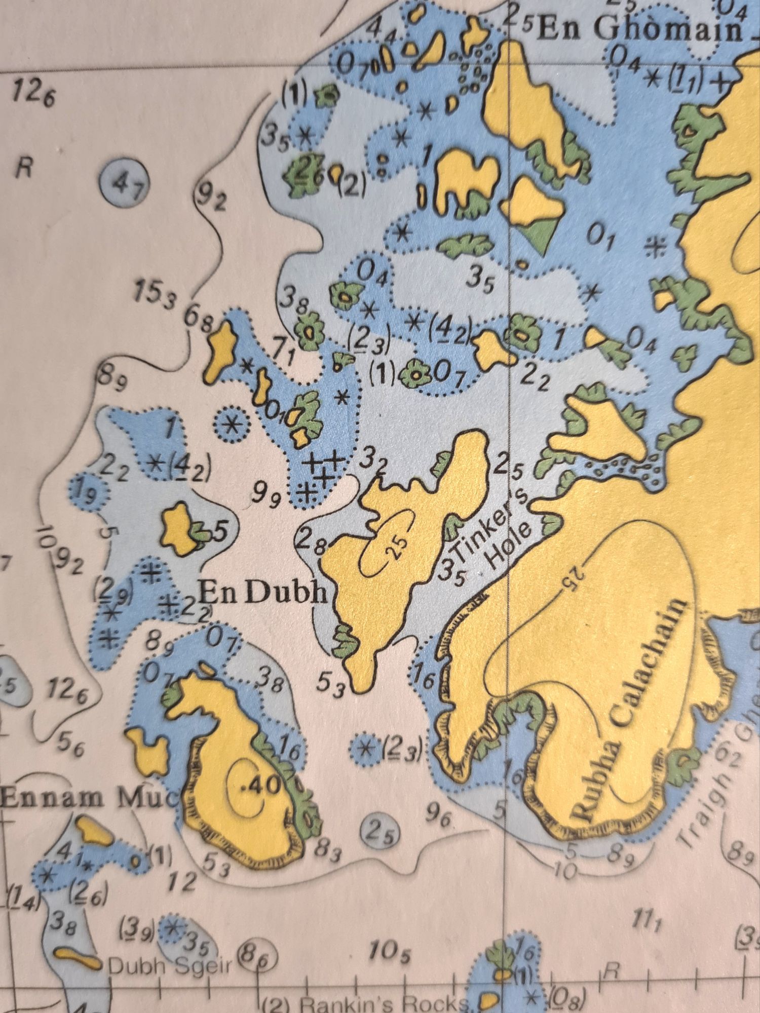 The wind was generally from the east, so it was a good time to see the little islands west of Mull – Treshnish, Ulva, Coll and Tiree, plus a night in beautiful Loch na Droma Buidhe and another in a sheltered gap in the rocks near Iona called Tinkers Hole. For this week, captioned photos tell the story.